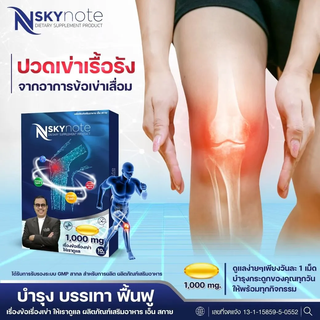 ให้คุณพร้อมทุกกิจกรรม เลือกสิ่งที่ดีเพื่อสุขภาพคัดสรรมาอย่างดีเพื่อสุขภาพกระดูกและข้อเข่า เลือก NSkynote ช่วยลดปวดเข่าเรื้อรังจากอาการข้อเข่าเสื่อม ดูแลง่ายๆ เพียงทานวันละ 1 เม็ดบำรุงกระดูกของคุณทุกวัน